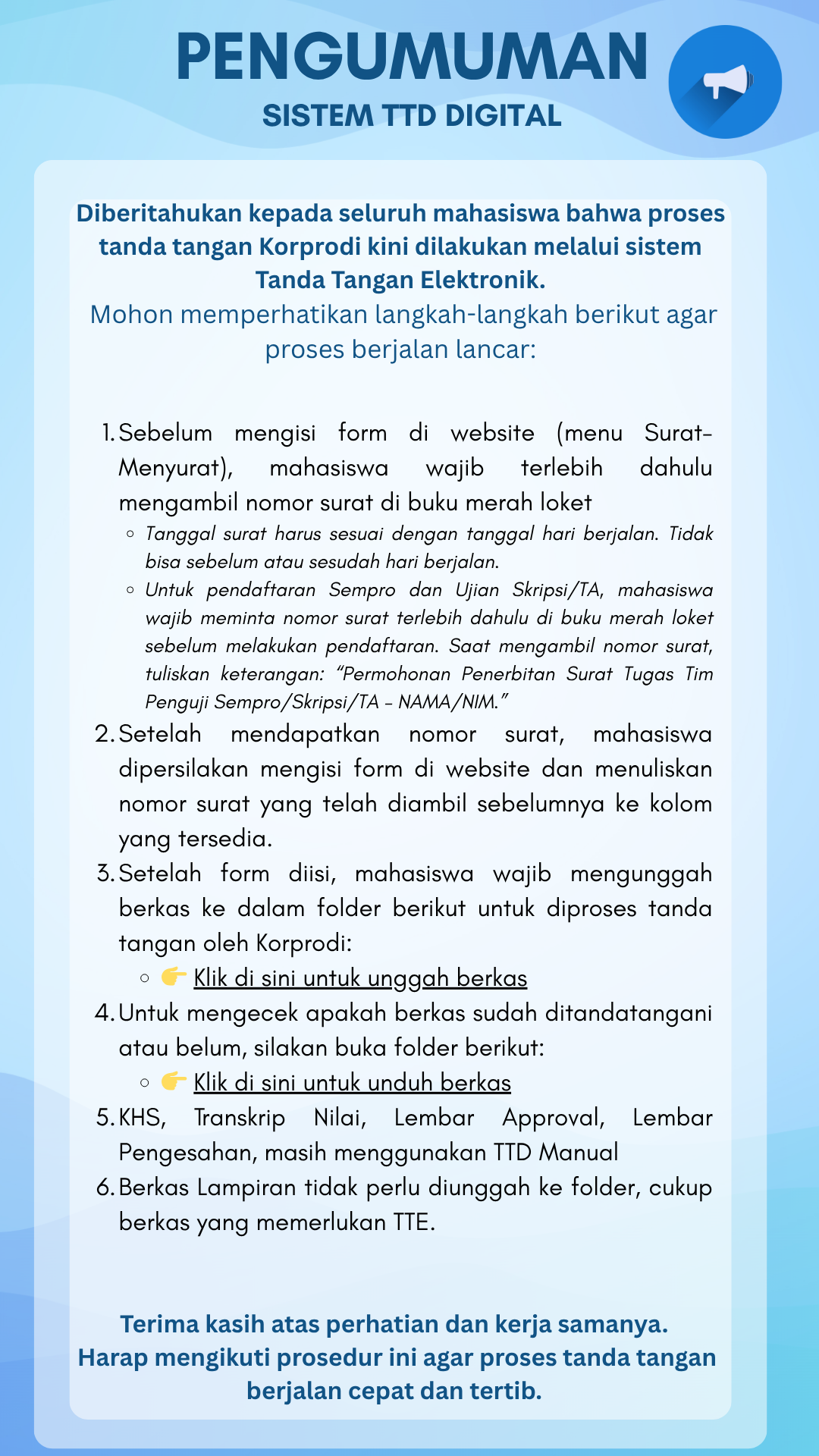 Untuk berkas yang memerlukan TTD manual, silakan menaruh berkas di keranjang berkas yang berada di depan ruangan Koordinator Prodi.
